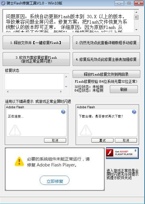 问题原因:由于最新版Flash插件兼容问题导致全屏游戏闪退,现主流浏览器Flash插件都停留在29.0最后版本,出现问题可使用此工具把系统内Flash修复并恢复至初始自带版本, 功能正常的Win10用户无需修复,也可以使用360一键重装Win10企业版2015系统或全新其他版本Win10、Win7系统即可正常!