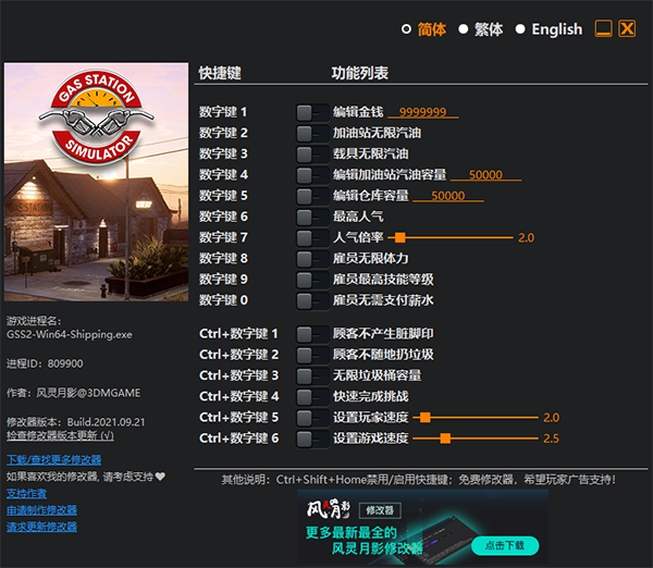1、在本站下载解压,得到加油站模拟器修改器风灵月影版安装包;2、安装完成后先开游戏