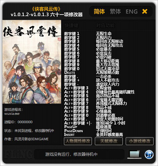 数字键 1 - 无限生命数字键 2 - 无限内力