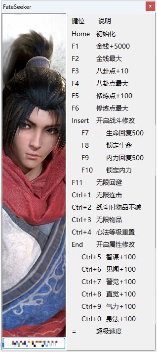 1.按Esc键进入暂停菜单,进入角色咨询,然后退到游戏场景来开启初始化,进入角色咨询界面再次退至游戏场景修改金钱,八卦,修炼点数。从暂停菜单回来刷新修改后数值。2.在战斗中时,打开"开启战斗修改",并进行生命内力的相关修改。