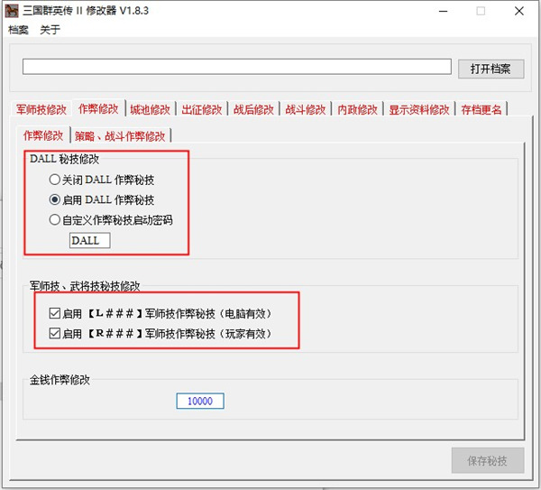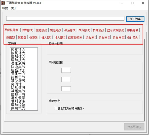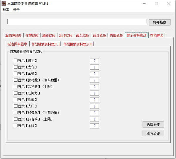 3、该辅助目前支持三国群英传2原版、楚汉英豪传、飞鹰版、煌星(水浒)版、风筝版、没有心情版、隋唐争霸、天使版、春天版、陈沐三国、路丰版、孤独战神、夏傲版以及修正版的存档修改;
