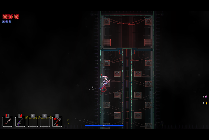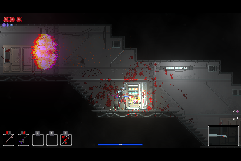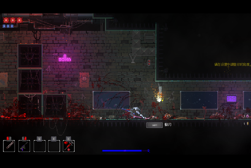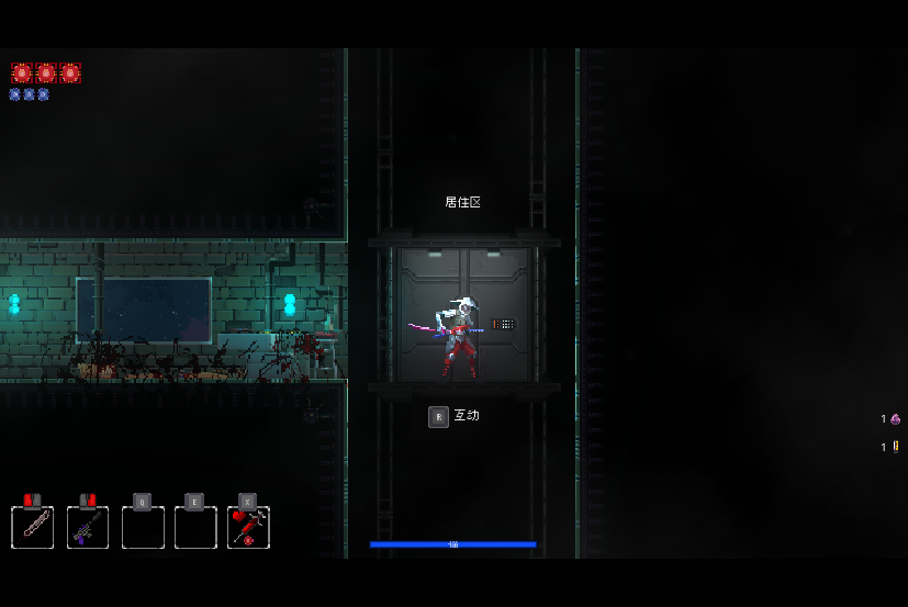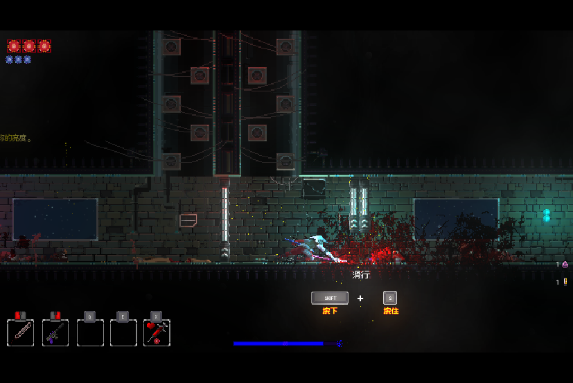 1、在游戏中,玩家拥有两种武器,左键为近战攻击,右键为远程枪械,左上角的红点为血量,蓝点为弹药数量,弹药的补充拥有多个办法,最简单的一种就是通过近战武器攻击敌人,会增加一点弹药。