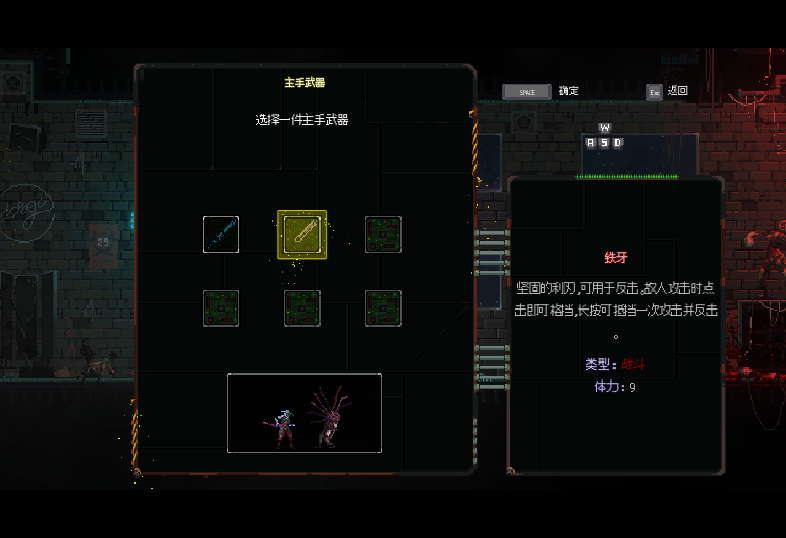 3、选择一把合适的武器,每把武器都有其独特的特性,随后点击“空格”完成选择,最后再点击“Esc”键退出选择界面,武器是可以重复选择的。