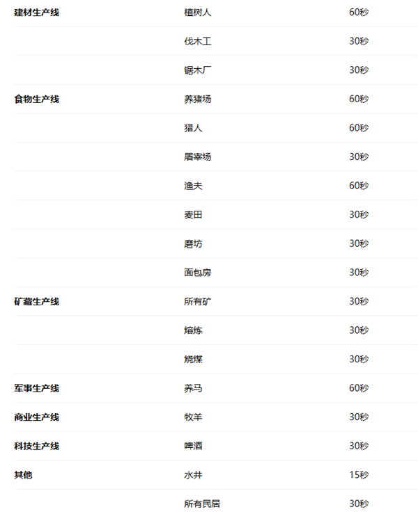 每60秒产出5个香肠,消耗2个小麦,2桶水。需要提供1口水井,以及至少1片麦田,注意麦田需要大约3格(3个仓库的面积)的空间耕作;