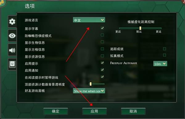 4、选项中可以调节众多游戏参数,点击language将其改为简体中文,点击应用,最后退出重新打开游戏以能完全生效;