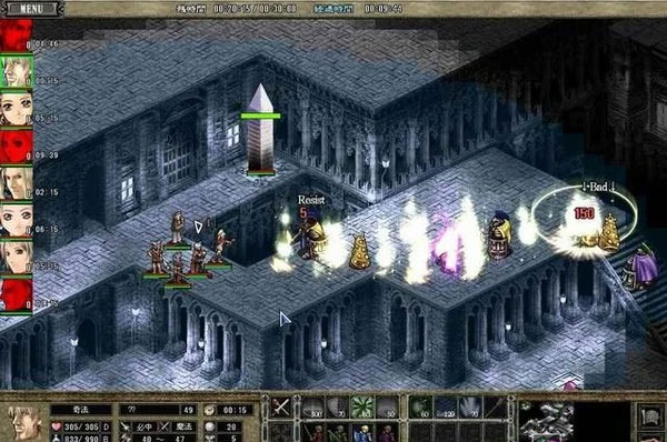 时间的调度是后期关卡中致胜的要素,因为每位队员都有时间属性(ET),级别越高的队员ET越少,因此战斗中要合理地安排各位队员的上场时间。行军时派移动速度快的猎人或剑士上场,遇到强敌作战再召唤重战士上场,还有地图上我方的圣泉也可利用来转移队员。在敌人少的时候尽量让用不到的队员退场,以保存战斗实力,免得后期无可用之兵。战斗中还要擅用编队,利用Ctrl+数字键可将队员编队,战斗中按数字键在不同编队中切换。一般来讲,重战士或剑士是近战主力可编为一队,猎人和魔法师以远程攻击为主可编为一队,僧侣用来辅助回复编为一队,这样战斗操作才能有条不紊。