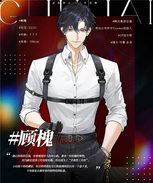 顾氏集团董事长,因为对小商品过于感兴趣,成立了自己旗下的电商潮玩公司“怀宇Cosmo”。