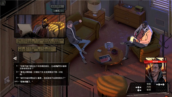 6、你能够以独属于自己的方式推进剧情,同时通过在图表中储存记忆来解锁意图和思维模式。你可以采用奇怪的思维模式进行出乎意料的有趣对话,并体验各种能够改变人格的状态效果,例如在喝醉时变得更外向,或在焦虑时变得格外敏感。