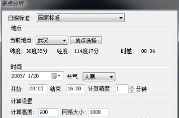 5、分析设置。选择遮挡物之后跳出对话框,要求对日照分析进行设置。以武汉市为例,选择地点-武汉市。《武汉市建设工程规划管理技术规定》,大寒日八点到十六点为有效计算时间