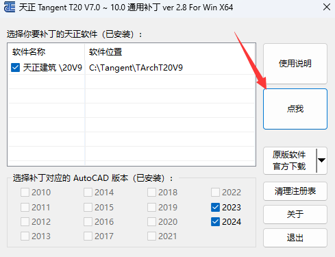 5、双击打开“Tangent_天正T20V7-V10补丁.exe”,然后点击“点我”;