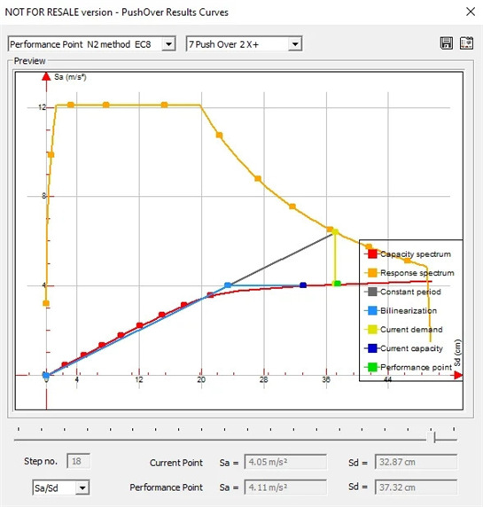 自 2021 版以来,Advance Design 中提供的 Pushover 分析已扩展为性能点计算。性能点是结构承载力(以推覆曲线表示)与地震需求(以地震动加速度响应谱(需求曲线)表示)之间的平衡点。根据 EC8 或 ATC40 将地震谱转换为 ADRS(加速度位移响应谱)谱,并将其与容量曲线叠加以定义性能点。这两条曲线以 ADRS 形式表示并叠加以图形方式查看性能点。Pushover 结果曲线中提供了相应的图表。