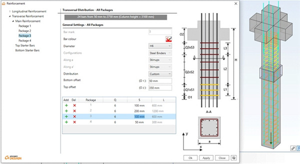 该程序的最新版本在钢筋混凝土模块中 3D 钢筋的生成和编辑方面引入了许多改进。其中之一是关于柱中横向钢筋编辑的完全修改部分。得益于表格中的编辑、钢筋包的链接以及分布类型的轻松选择,横向钢筋的编辑或生成既快速又直观。