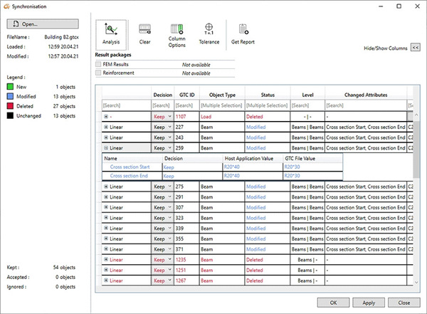 使用Graitec GTCX格式同步数据期间使用的对话窗口已被修改。这使得同步模型的过程变得更加容易和快捷。通过新选项,用户可以更好地控制同步数据。在众多改进和新功能中,我们可以提到轻松过滤数据的能力、轻松的表配置、更清晰的状态和变化呈现以及基于树的数据结构。此外,还可以选择导入到 Autodesk Revit 的结果范围。