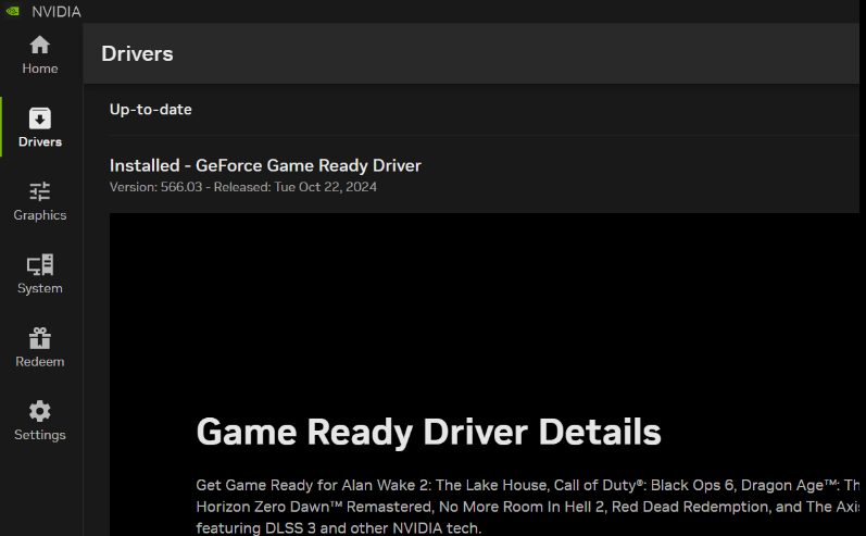 【主页】只需单击几下即可访问 NVIDIA App 的所有元素,加载并配置您最近使用的程序,查看最新的 NVIDIA 公告,并下载其他 NVIDIA 应用。