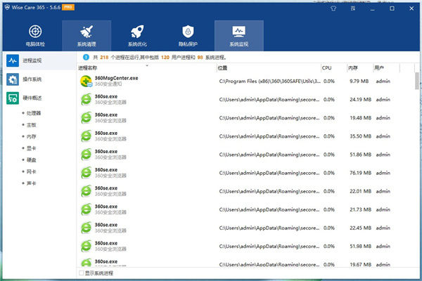 系统监视可以显示计算机的所有基本信息。进程监视为用户提供了一个清晰而整洁的列表,列出了用户和系统运行的所有进程,用户可以关闭任何不需要的过程,使PC运行更流畅。硬件概述为用户提供所有关键硬件组件的简明详细的信息,让用户对自己的计算机一目了然。