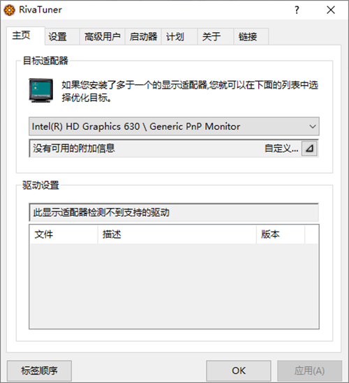 1、打开rivatuner中文版,第一次启动系统会自动扫描用户计算机的配置及硬件信息2、点击主页---在点驱动设置右边的自定义(边上的方块三角)