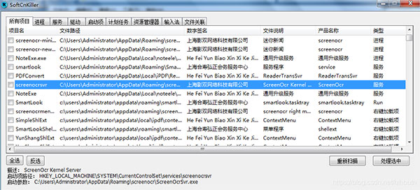 2、软件扫描完成后会把流氓软件列出来,可以看到路径,签名,类型等信息。