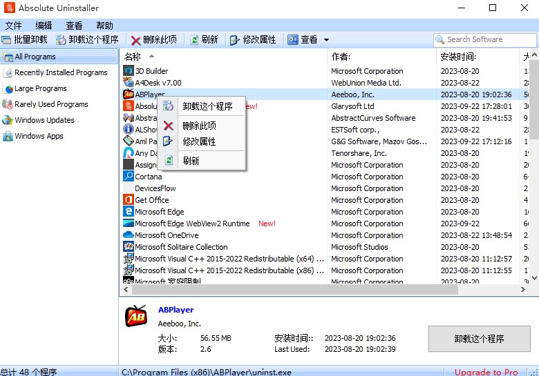 绝对的卸载程序启动比添加/与应用程序的加载最近安装的程序都相应的图标和标记删除程序更快。这样就可以很容易地找到你要卸载的应用程序。您也可以查找你想要的应用程序通过一个方便的搜索功能。