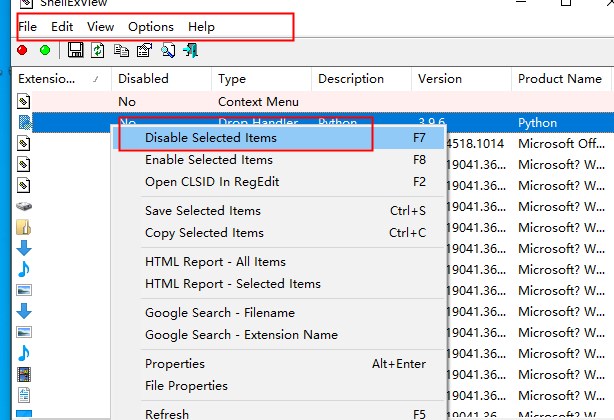 首先选择一个文件==点击文件菜单===禁用选择项目或者点击F7,可疑的外壳扩展将被以桃红色标记!