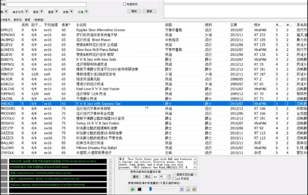 绝不夸张的说,BIAB 概括了音乐演奏的二三十个大类,共计千余种的风格模板!而我们的自动伴奏效果就取决于各种不同模板带来的不同听觉感受,每种模板在右边的MEMO里还有简要介绍,选定一个JAZZ风格之后,双击鼠标左键,你会听到,刚才还是欢快舞曲的感觉一下子变成柔情似水的爵士乐了!