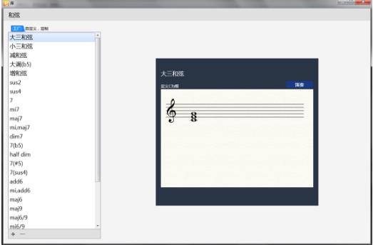 3.点击右上角的编辑库,弹出和弦库,这里可以看到一边是软件自带的和弦,你可以选择自定义、定制来添加自己的和弦
