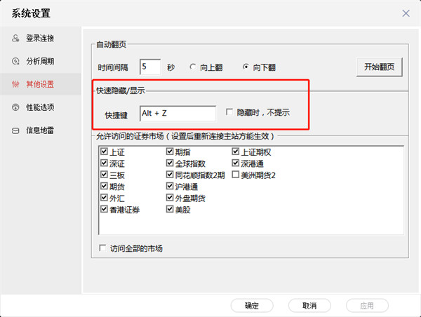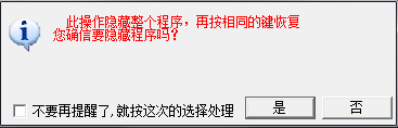 为了方便上班工作炒股用户的使用,我们提供了一键隐藏功能,即通过一个快捷键(俗称“老板键”)将程序界面完全隐藏(在任务栏、托盘区都不留痕迹),如需再次使用,只需要再按此快捷键即可,它的默认的快捷键为:Alt+Z