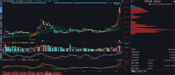 按下F7键就可以进入个股全景页面,个股全景提供了个股所有信息,包括了分时走势、技术分析、大盘对照、TICK走势、成交明细、价量分布、财务图示等七个画面。