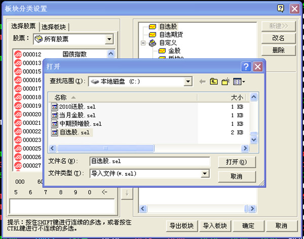 选择老版本软件保存的文件名,此处为C:盘“自选股.sel”,点击“打开”,导入成功。