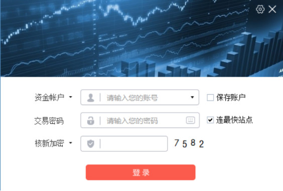 委托登录采用扁平化视觉效果,为委托设置功能提供前端入口,简化登录元素,方便用户操作。同时支持两融账户直接登陆无需选择账户直接输入即可,操作两融账户无需先登陆普通账户再登陆两融账户。支持站点选择,点击“连最快站点”软件默认选择最快站点。客户也可点击右上角设置—通信设置自己选择站点。
