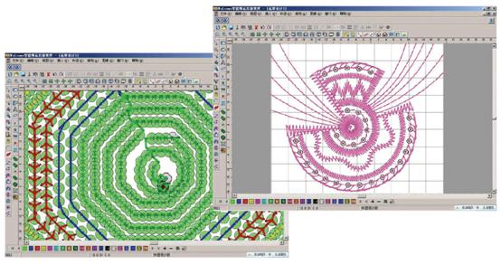c、带状分为对边、双边、中心。按数字化的变化宽度和针迹角度均匀地旋转针迹填充针迹线