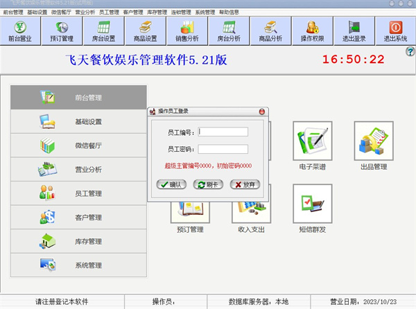 飞天餐饮娱乐管理系统官方版是一套功能强大而又简便实用的餐饮娱乐管理软件。软件包括前台营业、营业设置、营业分析、财务查询、库存管理、辅助管理、系统管理、帮助信息等八大功能模块,实现了餐饮娱乐企业日常营运的全面自动管理,可广泛适用于各种规模、各种类型的餐饮娱乐企业,如:餐厅、酒楼、歌舞厅、夜总会、桑拿、酒吧、咖啡厅、快餐店、综合娱乐场所等等。飞天餐饮软件稳定可靠、易学易用、管理严格、设置灵活,受到广泛好评。总之,软件总结了多年的应用实践经验,并参考了大量国内同类软件的优点,以真正产品化的方式进行了精心设计,功能模块清晰,界面美观友好,操作简便快捷,并提供完善的在线帮助和使用说明,是餐饮娱乐企业进行电脑信息化管理的理想选择。做餐饮管理的朋友们是不是心动了呢,那就赶快下载吧。无需注册,可免费使用。