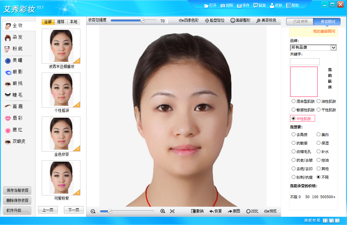 1、一键自动上妆。只要上传图片,然后动动手指,点击全妆中的已有妆容,即可实时展现妆容效果,艾秀彩妆软件提供了多种迷你妆容供大家选择!2、上妆后,仍然能保留图片的皮肤纹理,尤其是腮红和唇彩:一键上妆后,可以轻松体验。时尚潮流,随时随地,想变就变。还可以根据自己的脸型和需求,调整腮红的位置和颜色的浓度。