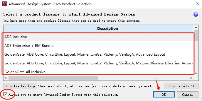 19、启动Advanced Design System 2025,勾选【Always try to...】并选中框里面的任意一个,点击【OK】。