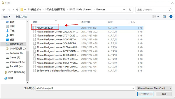 9、将会弹出一个窗口,然后打开软件初始安装包ad211 unis licewnses文件夹,找到AD20-Sandy.alf文件,单击选中它后再点击打开;