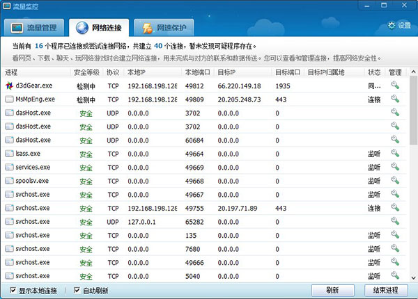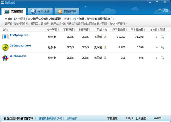 1、完全独立版,借此用户无需安装360安全卫士即可独立运行2、功能强大,自带流量管理、网络连接、网速保护三大功能