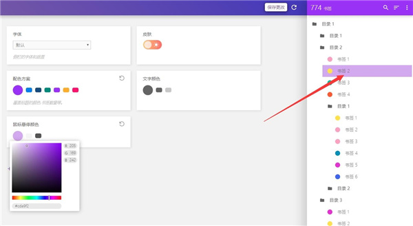 5、对书签栏的外观和使用方式(字体、配色方案、文字颜色,甚至鼠标悬停颜色等)都能进行自定义更改,进行调整