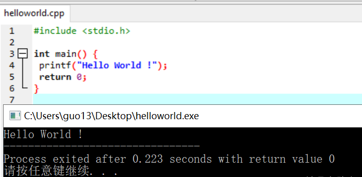c语言的结果会显示到终端(也可以叫它,命令窗口)上,这里可以看到输出结果“Hello World!”,就说明执行成功啦!