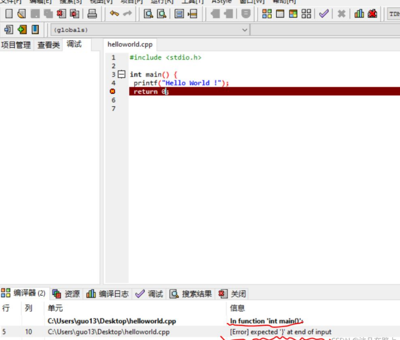 一般我们在写的代码时候,很难一次就写对,如果代码中存在问题,是无法顺利执行的,程序(其实,它叫编译器)会帮你定位到出错的位置附近(红色行显示),下方的窗口会显示具体的错误信息: