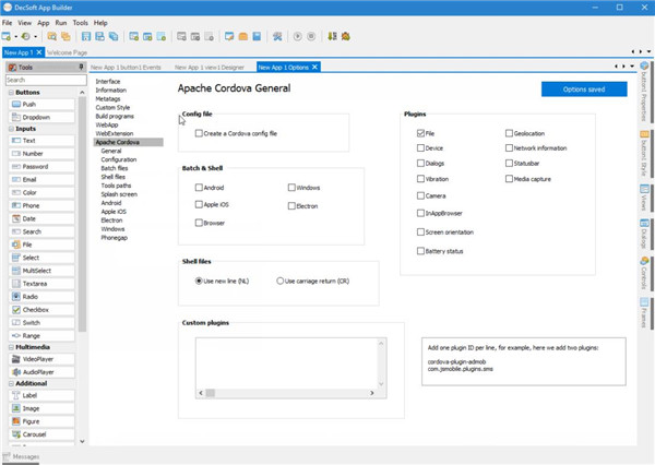 DecSoft App Builder 与 Apache Cordova 集成,为您的应用程序准备正确的配置文件、平台图标、启动画面、批处理文件、shell 文件和 JSON 文件。DecSoft App Builder 还集成了官方的 Apache Cordova 插件