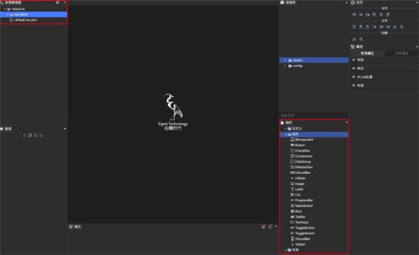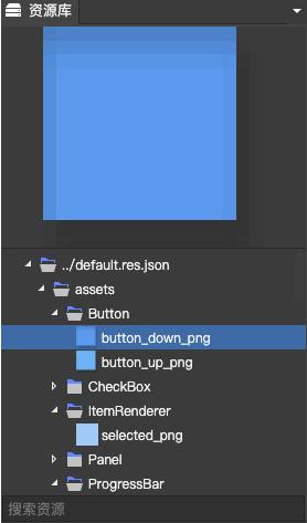 通过资源库面板 ,可以将资源素材拖拽到UI场景中去,通过下方的搜索资源框,输入文件名,可以快速查找资源