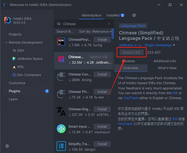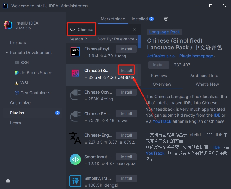 3、在插件中心内搜索Chinese,然后点击Install安装中文语言包。