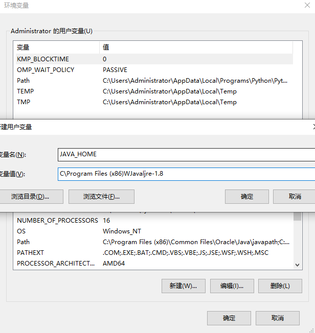 4、点击“环境变量”弹出该选项弹框,如下图所示。在这里新建环境变量JAVA_HOME,配置值是java的JRE安装目录。(步骤1路径:C\Program Files (x86)WJavaljre-1.8)。