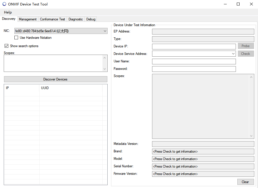 1.打开该软件,选择本机的IP为192.168.2.231(自动显示),点击Discover Devices按钮后,将支持Onvif协议的同一个局域网内的前端设备搜索的地址搜索出来,显示在下方,右上方为h获取的每个设备的uuid,ip等信息。2.选择其中一台设备测试,点击check按钮,读取响应的IPc信息