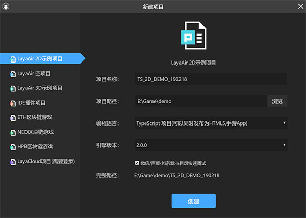 2、选择 LayaAir 2D示例项目 在填写项目名称、项目路径、以及选择编程语言和引擎版本后,点击“创建”即可建立一个新的空项目。
