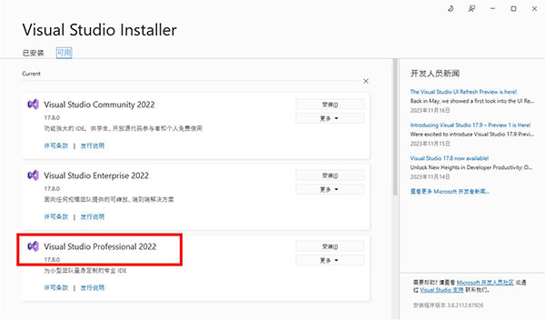 4、选择要加载的工作负荷,在可用选项中选择Visual Studio Professional 2022