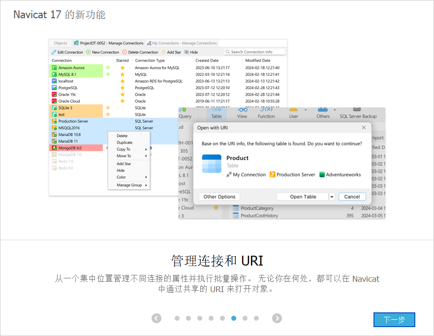 从一个集中位置管理不同连接的属性并执行批量操作。无论你在何处,都可以在Navicat中通过共享的URI来打开对象。