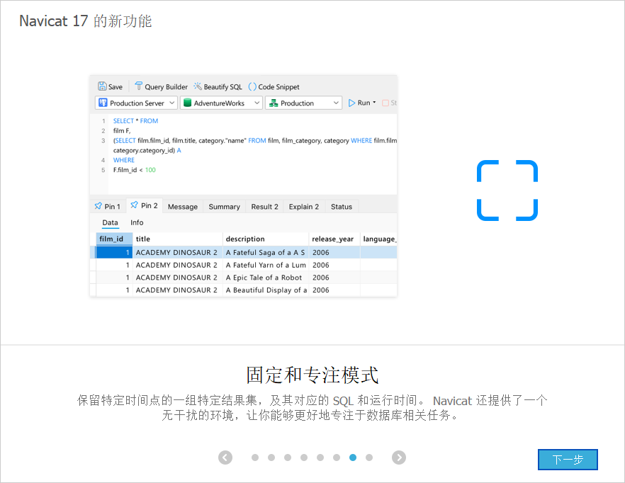 保留特定时间点的一组特定结果集,及其对应的SQL和运行时间。Navicat还提供了一个无干扰的环境,让你能够更好地专注于数据库相关任务。