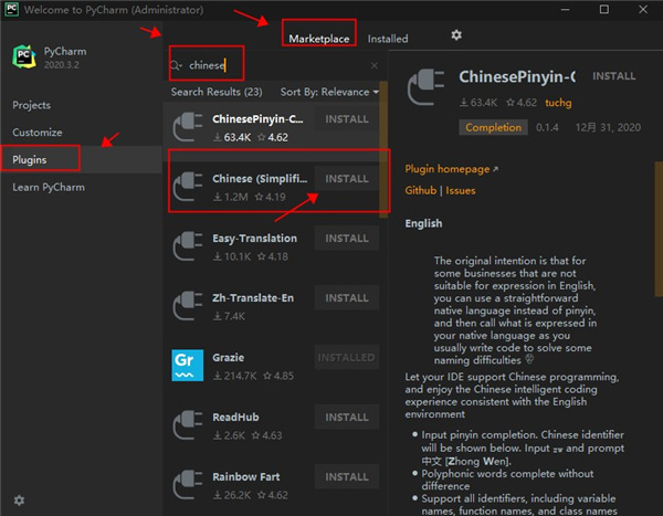 5、在maketpleace选项中,输入Chinese,找到中文语言包然后点击install;