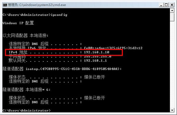2.输入Ipconfig,同时点击Enter键,在IPv4栏中即可查看到相应的ip地址