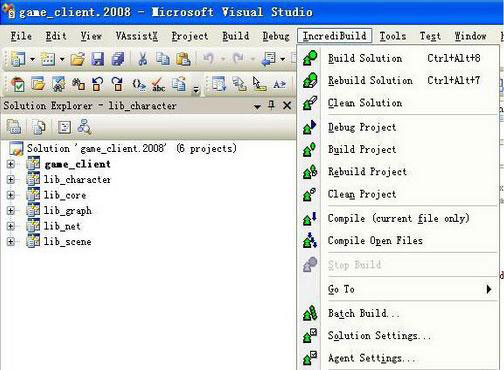 打开VS在菜单栏上多出了一项IncrediBuild的选项。这样就可以在“IncrediBuild”菜单下进行联合编译了